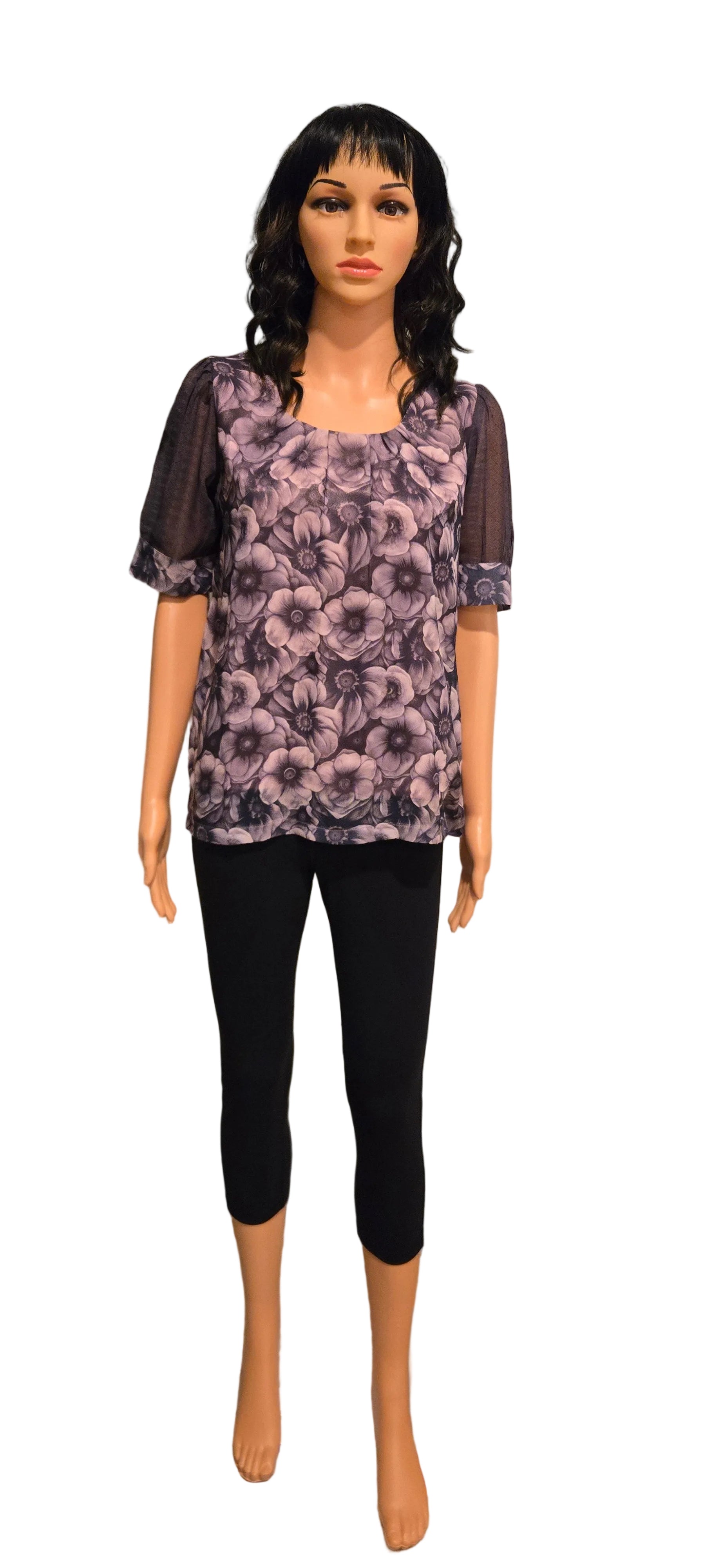 Elegant purple floral crepe top with luxurious satin lining, designed for refined sophistication and all-day comfort.